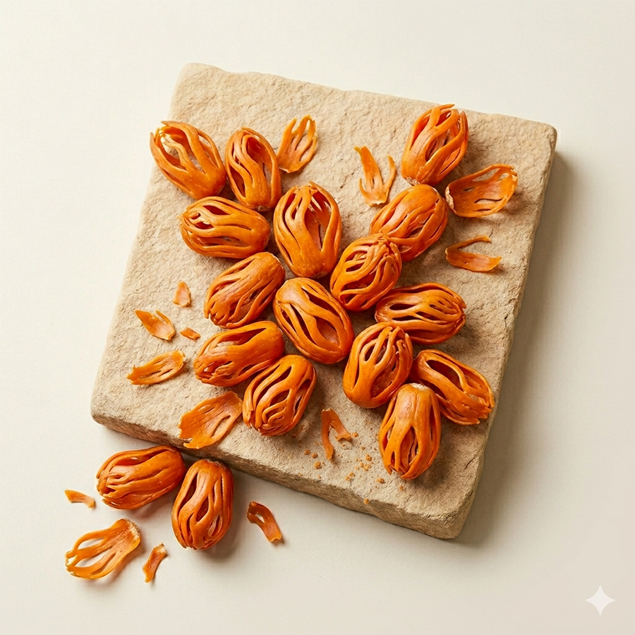 Our Nutmace (often called Mace) is truly one of nature’s most beautiful surprises. If you have ever seen a nutmeg fruit when it first cracks open, you will see a striking, bright red lacy covering wrapped tightly around the hard seed. That lace is what we call Mace. We harvest it with very gentle hands because it is delicate and can break easily. Once it is dried in the warm sun, it turns from a fiery red to a lovely golden orange. It has a flavor that is a bit like nutmeg but much more refined—it’s lighter, more floral, and has a very elegant sweetness that makes it a favorite for those who want a "secret" ingredient that nobody can quite name.